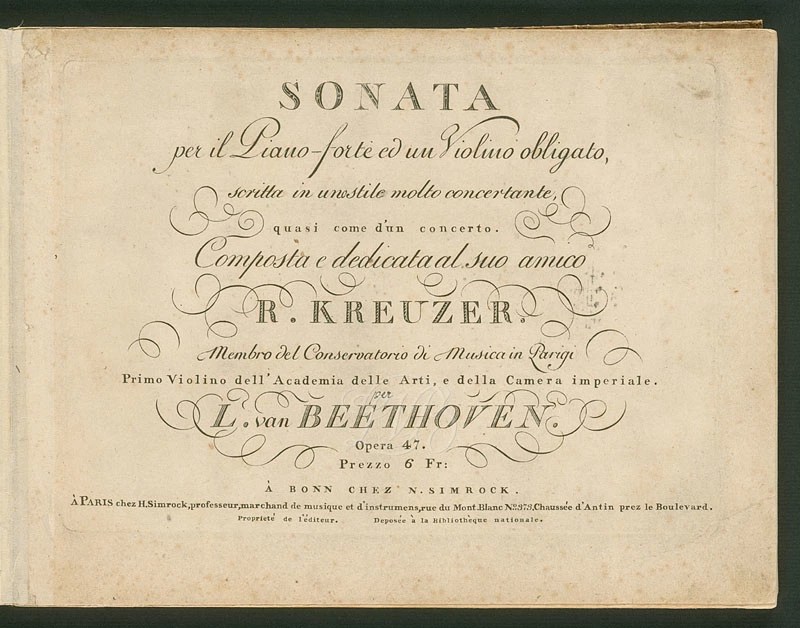 Sonata for piano and violin obbligato written in a concertante style, similar to a concerto, composed and dedicated to his friend, R. Kreuzer, member of the Conservatory of Music in Paris, first violin of the Academy of Arts, and of the Imperial Chamber, by L. van Beethoven.